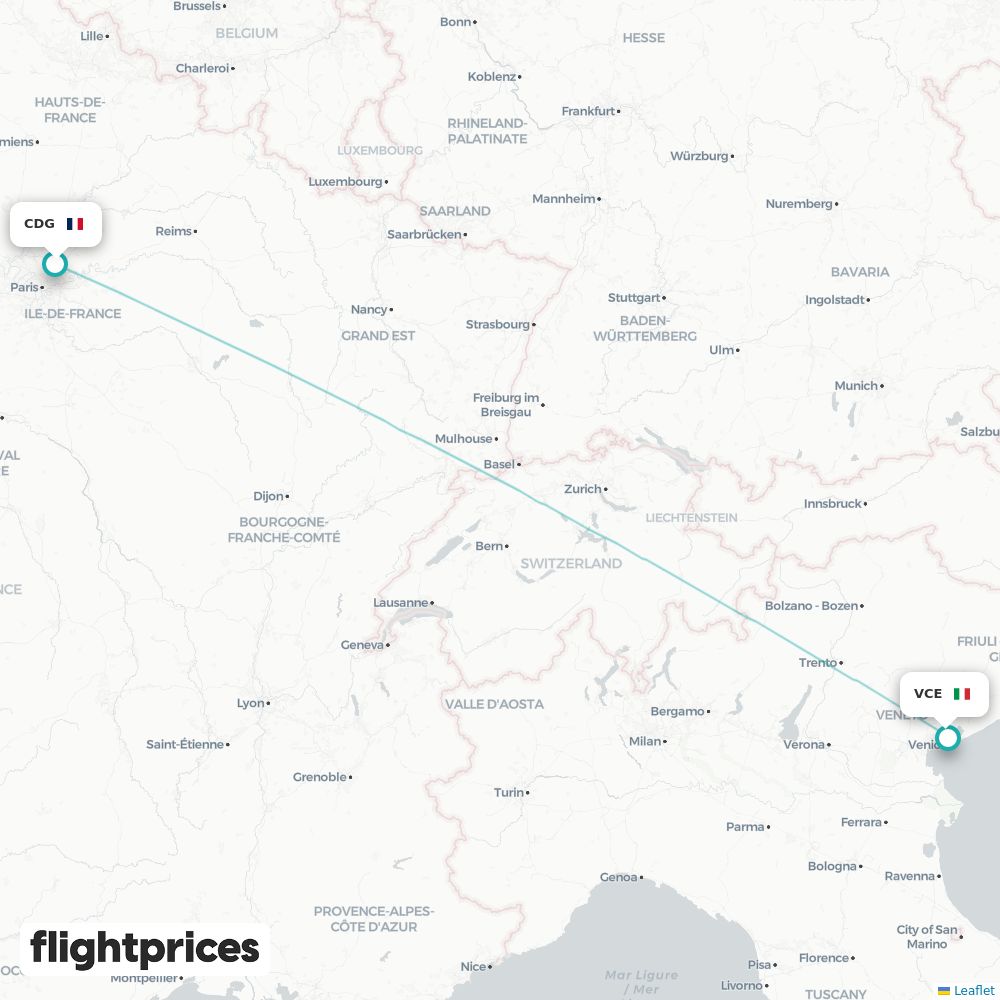 A quick snapshot of Paris (CDG) to Venice (VCE) fares — lowest and typical prices plus the cheapest months and weekdays to fly, the airlines on the route and the usual duration for travel from France to Italy.