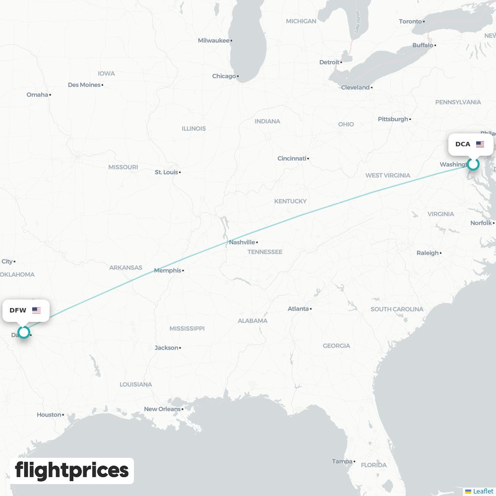 A quick snapshot of Washington, D.C. (DCA) to Dallas (DFW) fares — lowest and typical prices plus the cheapest months and weekdays to fly, the airlines on the route and the usual duration.