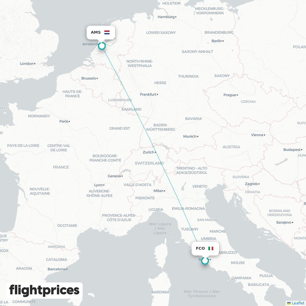 A quick snapshot of Rome (FCO) to Amsterdam (AMS) fares — lowest and typical prices plus the cheapest months and weekdays to fly, the airlines on the route and the usual duration for travel from Italy to Netherlands.