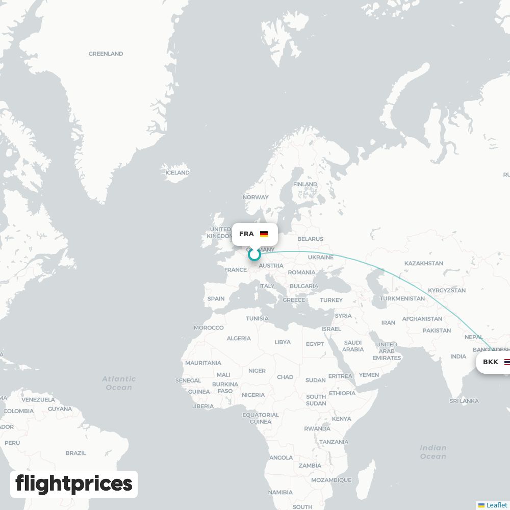 A quick snapshot of Frankfurt am Main (FRA) to Bangkok (BKK) fares — lowest and typical prices plus the cheapest months and weekdays to fly, the airlines on the route and the usual duration for travel from Germany to Thailand.