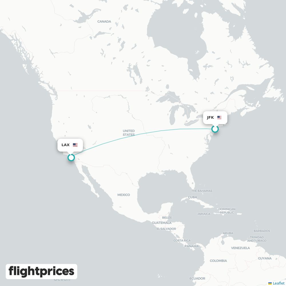 A quick snapshot of New York (JFK) to Los Angeles (LAX) fares — lowest and typical prices plus the cheapest months and weekdays to fly, the airlines on the route and the usual duration.