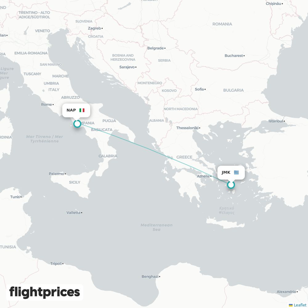 A quick snapshot of Mykonos (JMK) to Naples (NAP) fares — lowest and typical prices plus the cheapest months and weekdays to fly, the airlines on the route and the usual duration for travel from Greece to Italy.