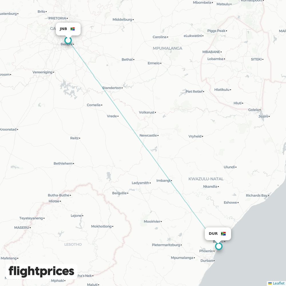 A quick snapshot of Johannesburg (JNB) to Durban (DUR) fares — lowest and typical prices plus the cheapest months and weekdays to fly, the airlines on the route and the usual duration.