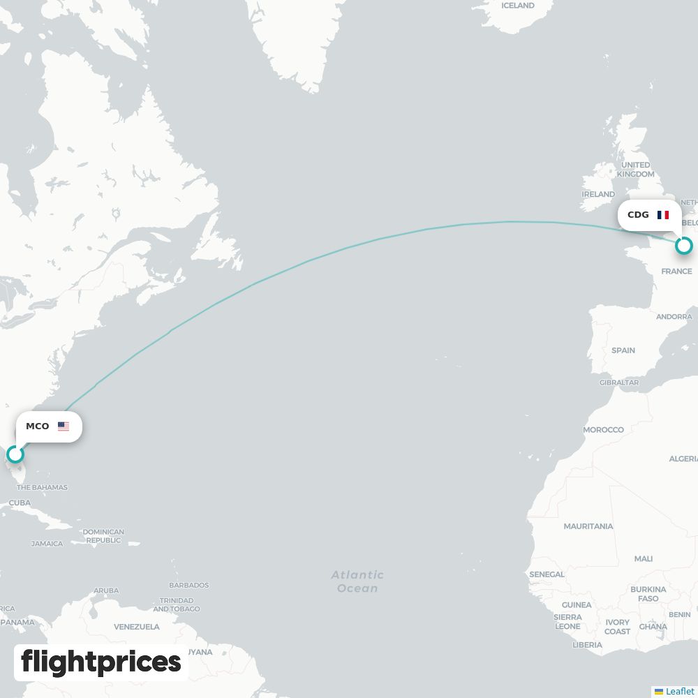 A quick snapshot of Orlando (MCO) to Paris (CDG) fares — lowest and typical prices plus the cheapest months and weekdays to fly, the airlines on the route and the usual duration for travel from United States to France.