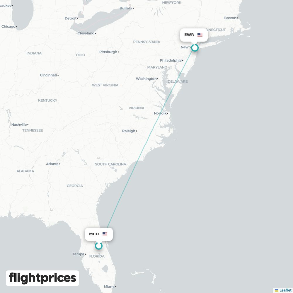 A quick snapshot of Orlando (MCO) to Newark (EWR) fares — lowest and typical prices plus the cheapest months and weekdays to fly, the airlines on the route and the usual duration.