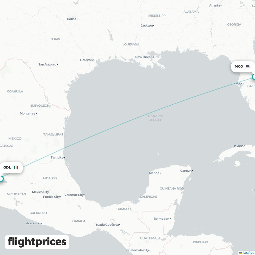 A quick snapshot of Orlando (MCO) to Guadalajara (GDL) fares — lowest and typical prices plus the cheapest months and weekdays to fly, the airlines on the route and the usual duration for travel from United States to Mexico.
