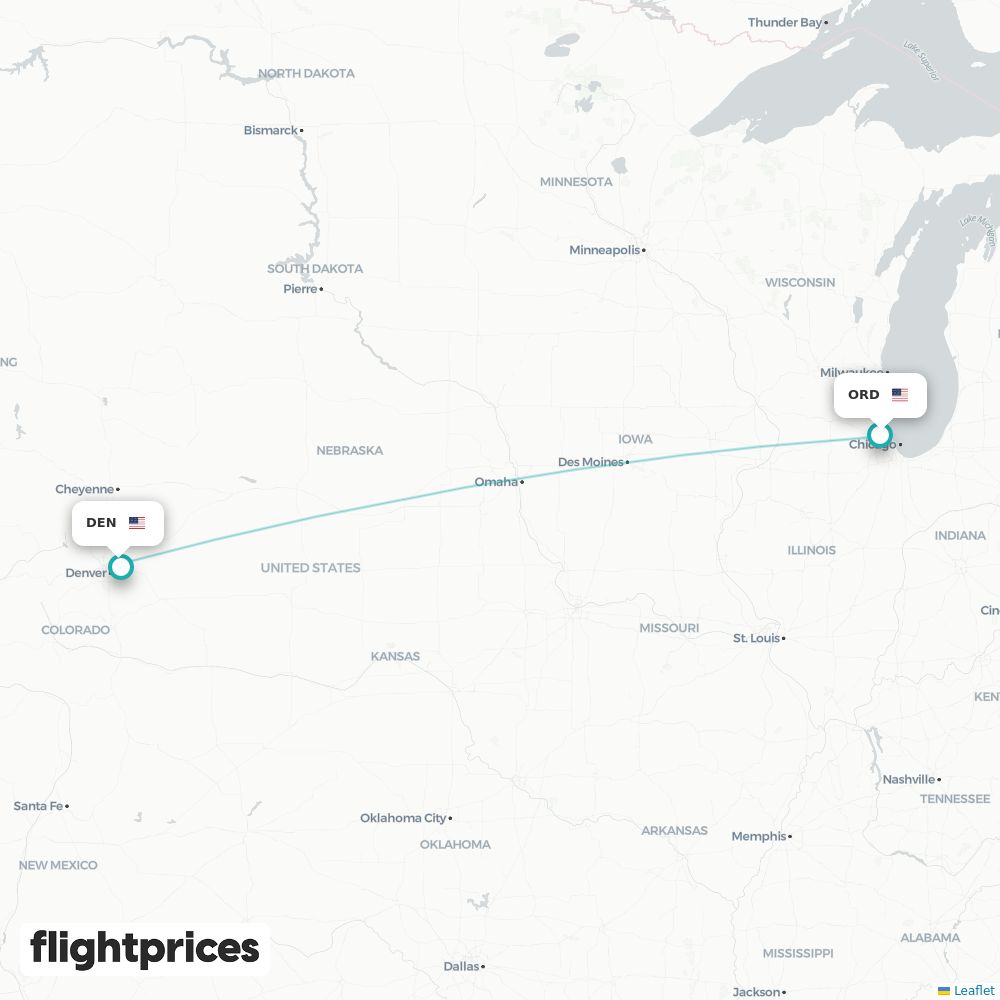 A quick snapshot of Chicago (ORD) to Denver (DEN) fares — lowest and typical prices plus the cheapest months and weekdays to fly, the airlines on the route and the usual duration.