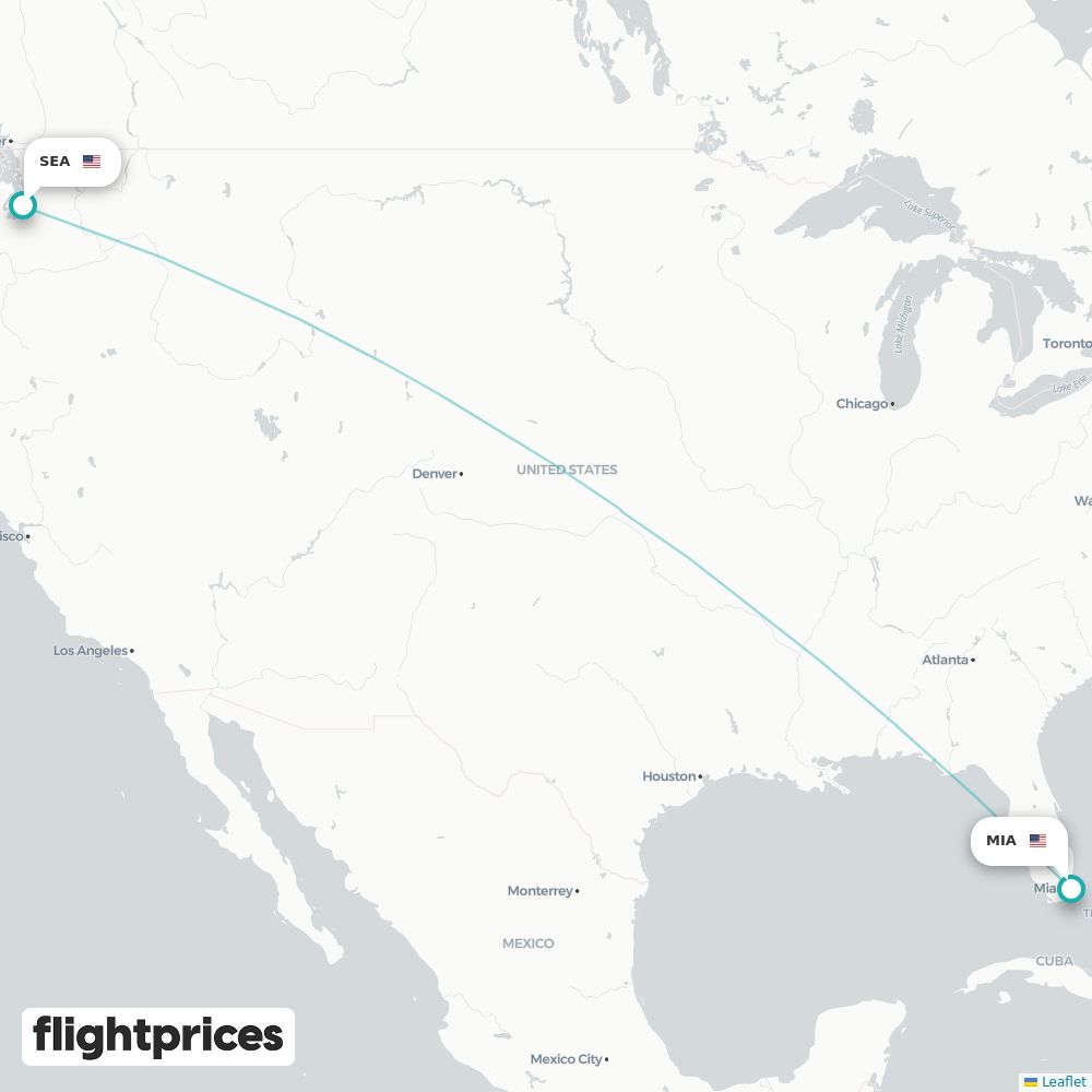 A quick snapshot of Seattle (SEA) to Miami (MIA) fares — lowest and typical prices plus the cheapest months and weekdays to fly, the airlines on the route and the usual duration.