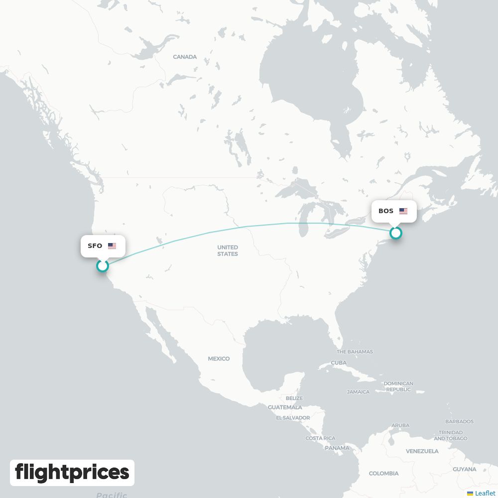 A quick snapshot of San Francisco (SFO) to Boston (BOS) fares — lowest and typical prices plus the cheapest months and weekdays to fly, the airlines on the route and the usual duration.