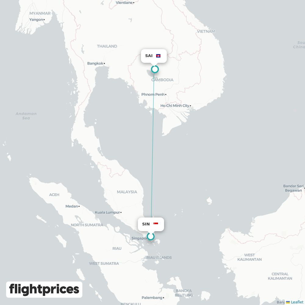 A quick snapshot of Singapore (SIN) to Siem Reap (SAI) fares — lowest and typical prices plus the cheapest months and weekdays to fly, the airlines on the route and the usual duration for travel from Singapore to Cambodia.