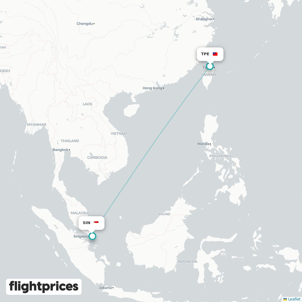 A quick snapshot of Taipei City (TPE) to Singapore (SIN) fares — lowest and typical prices plus the cheapest months and weekdays to fly, the airlines on the route and the usual duration for travel from Taiwan to Singapore.