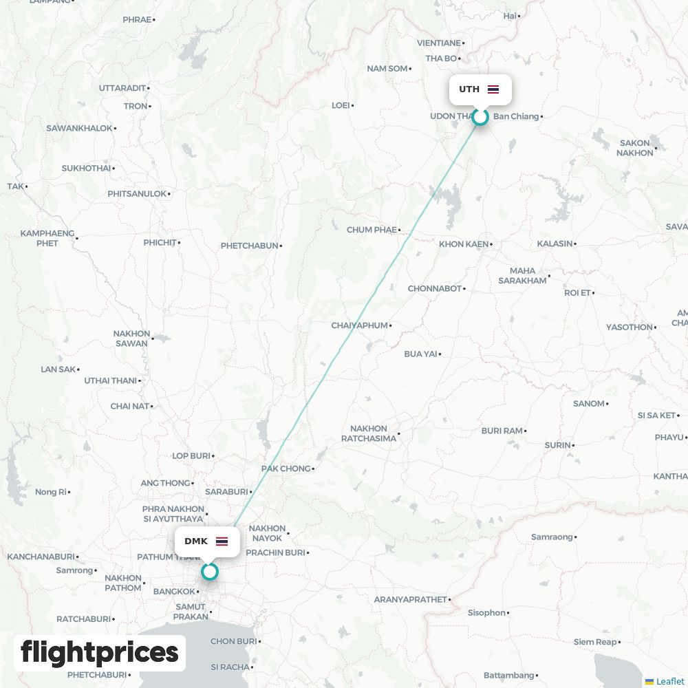 A quick snapshot of Udon Thani (UTH) to Bangkok (DMK) fares — lowest and typical prices plus the cheapest months and weekdays to fly, the airlines on the route and the usual duration.