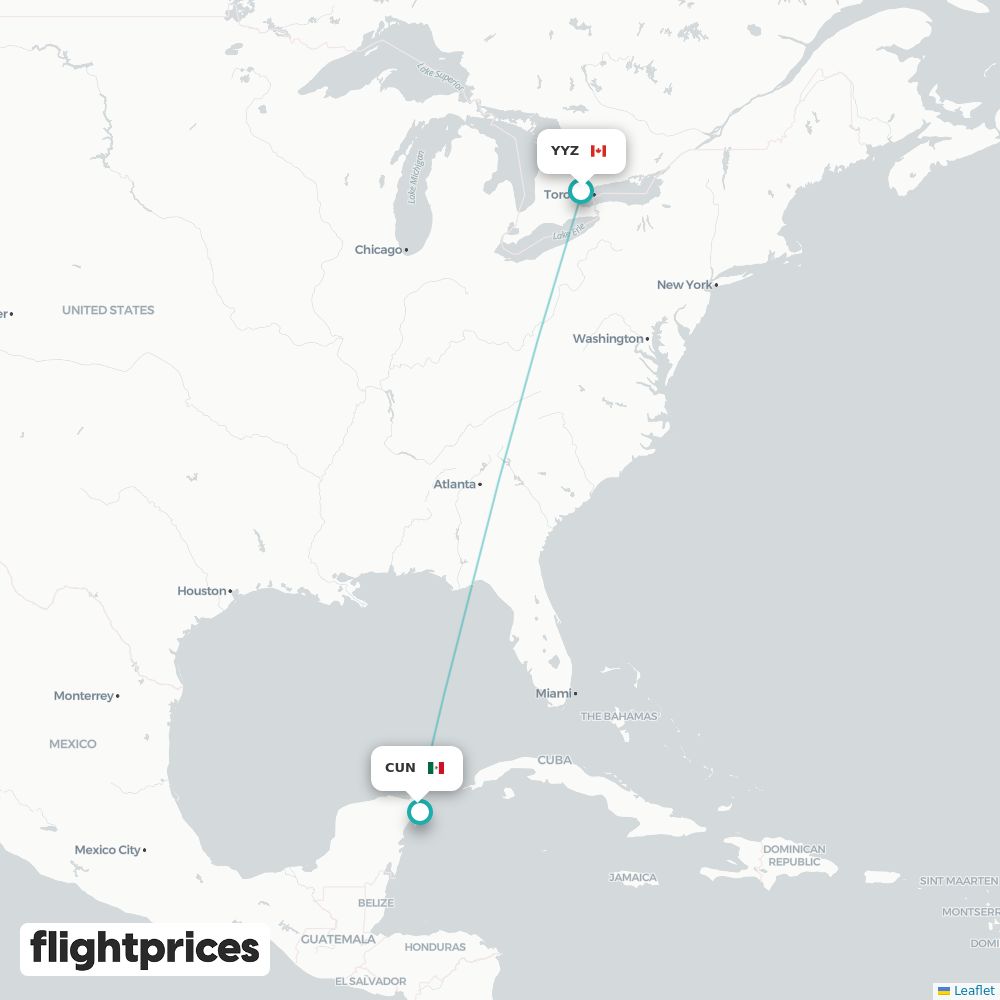 A quick snapshot of Toronto (YYZ) to Cancún (CUN) fares — lowest and typical prices plus the cheapest months and weekdays to fly, the airlines on the route and the usual duration for travel from Canada to Mexico.